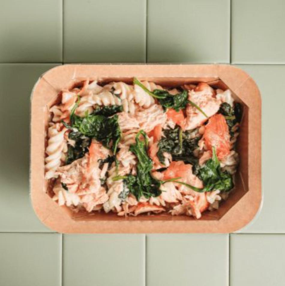 Fusilli 3 Farben mit Lachs (frisch und geräuchert), Spinat, Pinienkernen, italienischer Käsecreme. Gericht zum Aufwärmen im Backofen oder in der Mikrowelle, kalt geliefert.