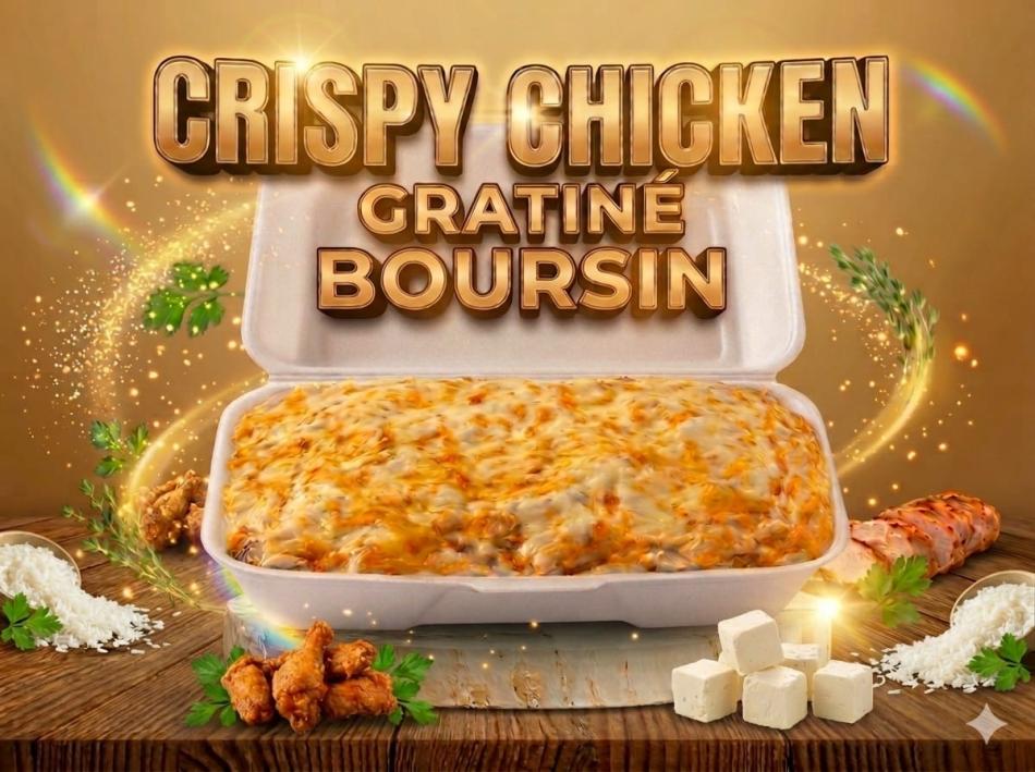 Duftreis, hausgemachte süß-saure Sauce, knuspriges Halal-Hähnchen, Röstzwiebeln, hausgemachte Boursin-Sauce, überbackener Käse.