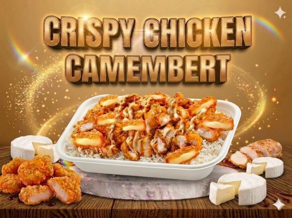 Duftreis, Käsesauce, Chicken Tenders, panierter Camembert, Pfeffersauce, Sweet-Chili-Sauce, Röstzwiebeln.