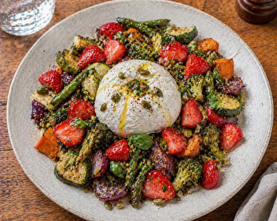 Cremiger Burrata-Mozzarella, serviert mit geröstetem und knackigem Gemüse, garniert mit Erdbeeren, Kürbiskernen und Basilikum-Zitronen-Dressing.