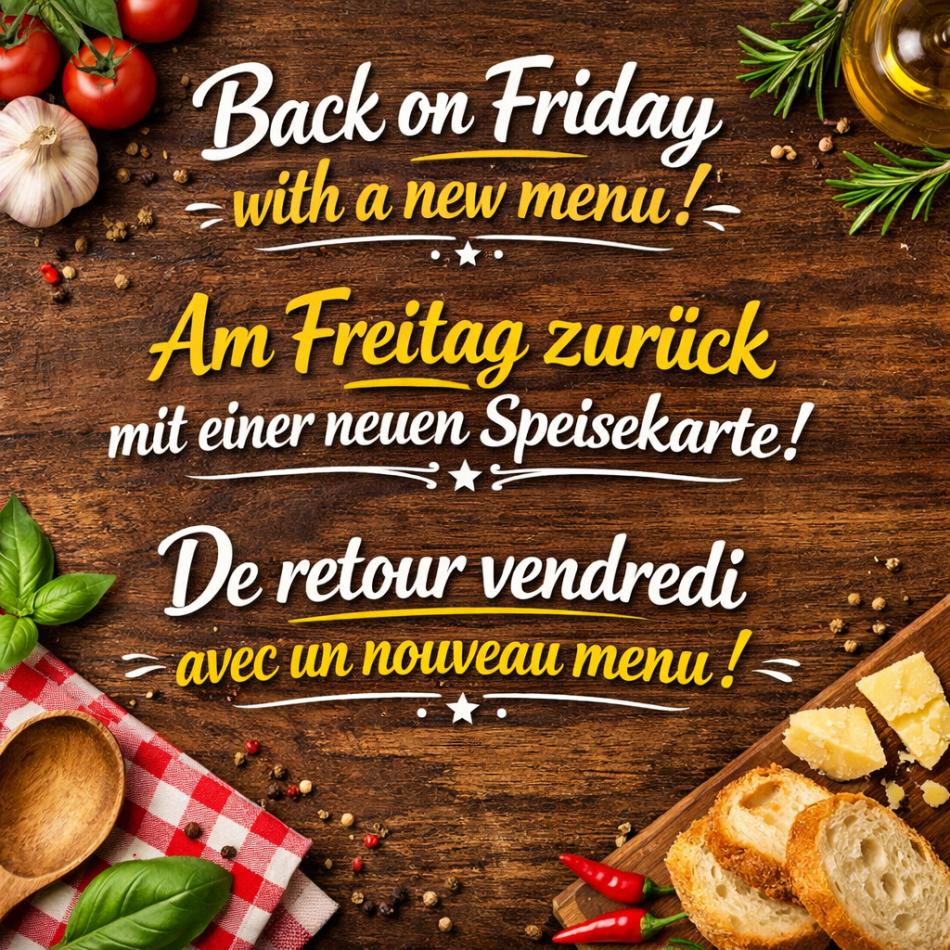 Bestell Deadline kann sich aber taeglich aendern je nach Sitaution (Verkehr, Anzahl Bestellungen, Wetterbedingungen etc.). Am Freitag sind wir wieder da mit einer neuen Speisekarte!