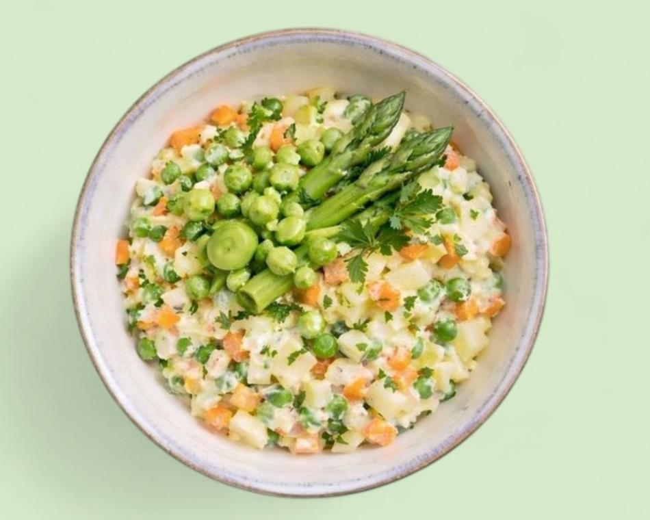 Salat aus Karotten, Erbsen, Kartoffeln, Eiern, Spargel und Mayonnaise.