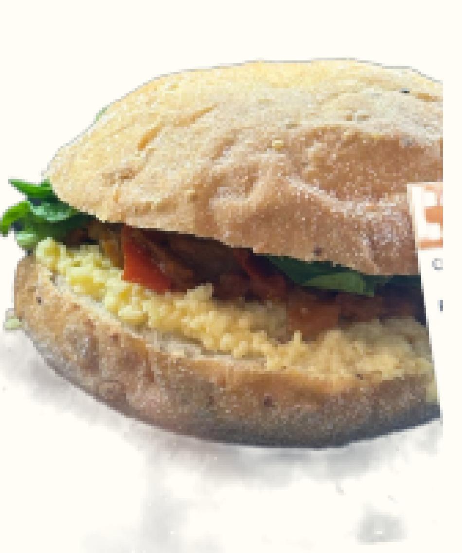 Zutaten: Bagel (WEIZEN, Wasser, WEIZEN-Sauerteig (Wasser, WEIZENmehl), Sonnenblumenkerne, Kürbiskerne, Hirse, Rapsöl, Rohrzucker, Hefe, Quinoa, jodiertes Salz, Dinkelmehl, GERSTENMALZMEHL, Antioxidationsmittel (Ascorbinsäure), Enzyme), Rührei 26,7 % (EI, rekonstituierte MAGERMILCH, LAKTOSE und MILCHEIWEISE, modifizierte Stärke, Salz, Säuerungsmittel: Zitronensäure, Verdickungsmittel: Xanthan, Schnittlauch, Dill, Salz), Aubergine (Tomatenmark, Paprika, Zwiebel, Rapsöl, Harissa-Sauce, Kreuzkümmel, Paprika, Salz, Aubergine, Gewürze, Rosinen, Pfeffer), Salat