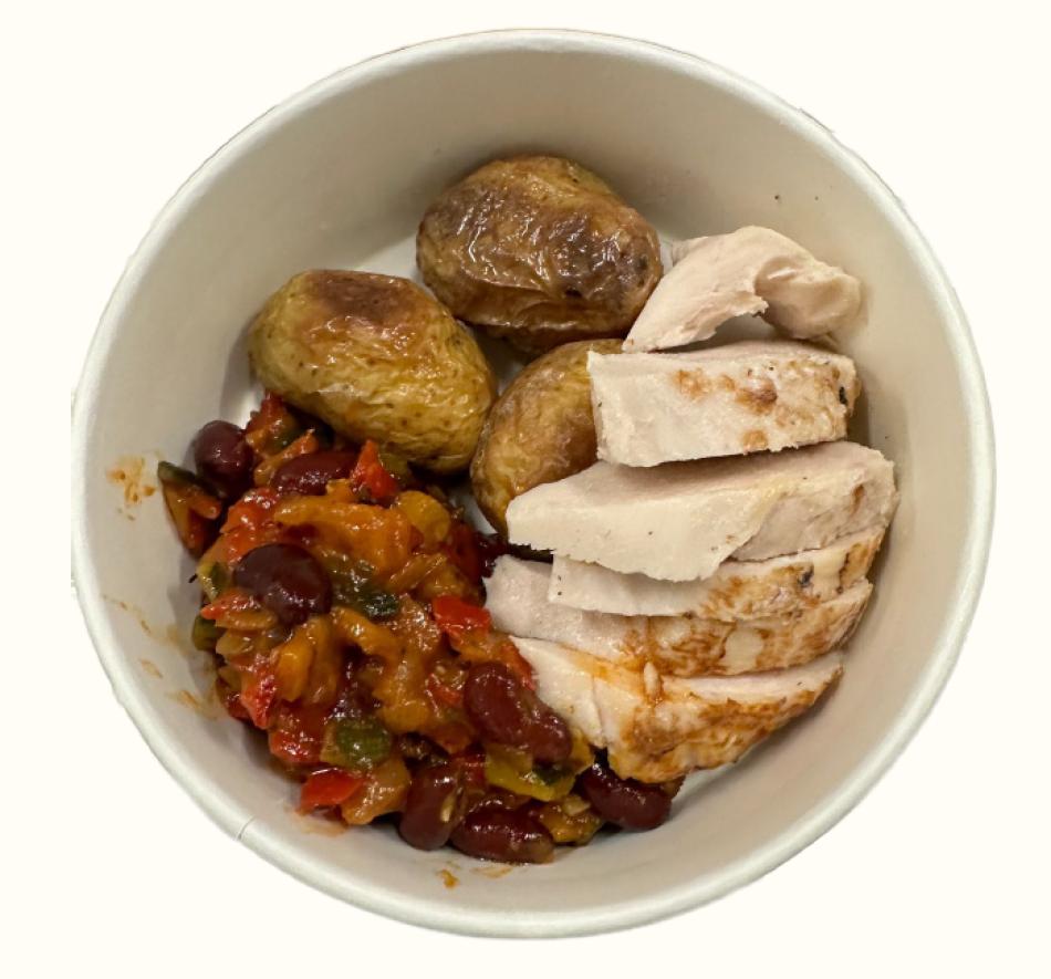 Gemischtes Gemüse (rote Kidneybohnen, rote Paprika 7,1 %, Zucchini 7,1 %, Tomaten, Zwiebeln, Rapsöl, Tomatenmark, Knoblauch, Salz, Selleriebrühe, Harissa-Sauce (Chilischoten, Knoblauch, Salz, Koriander, Kümmel, Zitronensäure), Kräuter der Provence), Hähnchenfilet (FR) 31,25 %, Bratkartoffeln (Kartoffeln 28,87 %, Petersilie, Rapsöl).