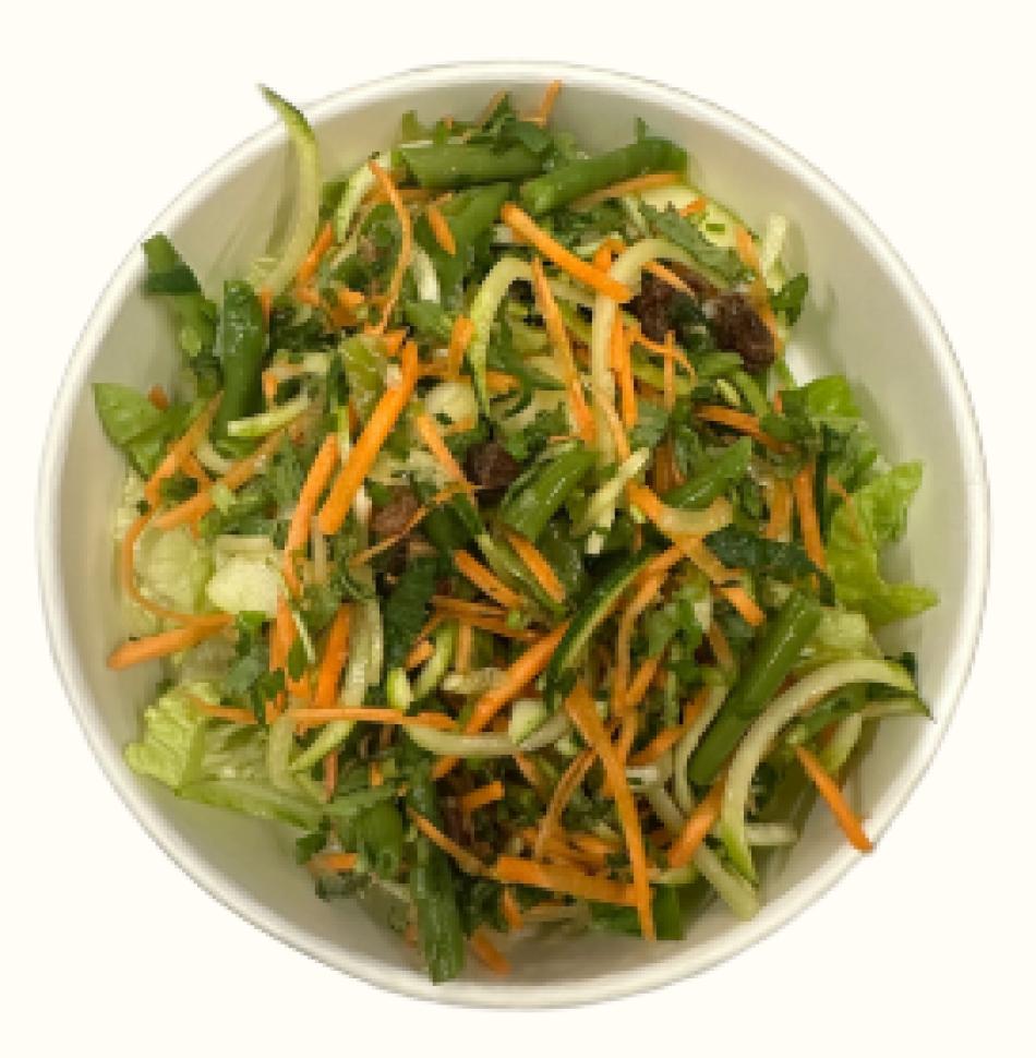 Gemischtes Gemüse (grüne Bohnen 21,8 %, Zucchini 17,4 %, Karotten, Äpfel 8,7 %, Weintrauben, Schnittlauch, Koriander, Minze, Sonnenblumenöl), Blattsalat. Kann Spuren von Gluten, Ei, Fisch, Erdnüssen, Soja, Schalenfrüchten, Sellerie, Senf und Sesam enthalten.