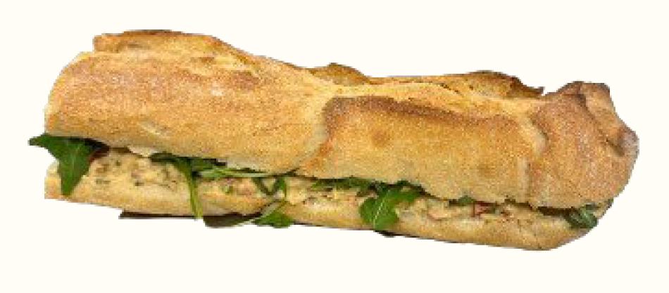 Zutaten: Baguette (WEIZENmehl, Wasser, Reisgrieß, Salz, Hefe, GERSTENMALZmehl, Ascorbinsäure, Acerolapulver), Miso-Aufstrich 36,7 % (Hummus pur (Kichererbsen, Olivenöl, Salz, Knoblauch, Zitronensaft, Pfeffer, SESAMöl, SOJABOHNENöl, Rapsöl), weißes Miso (SOJABOHNEN, Reis, Salz, Reismalz), Fenchel, Kimchi-Gewürze (Knoblauch, Salz, Chili, Ingwer), Dill), Salat