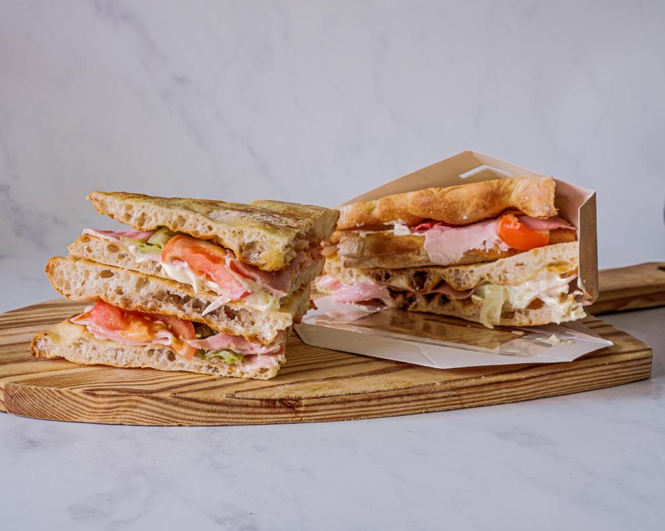 2 gefaltete Pinsa-Sandwiche mit Schinken